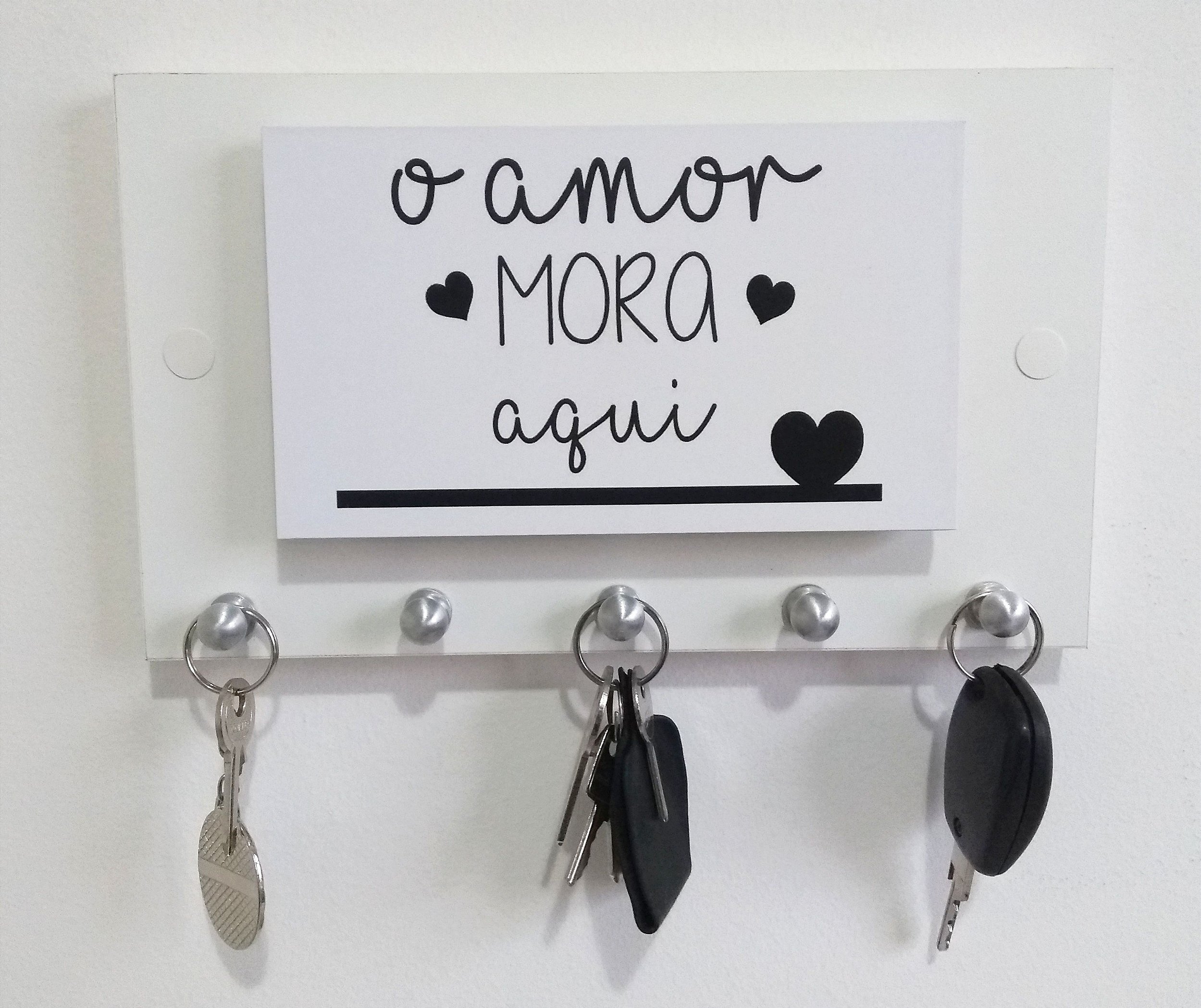 Material: 100% em MDF branco, bordas em PVC branco, texto adesivado e suporte chaves em metal acetinado.